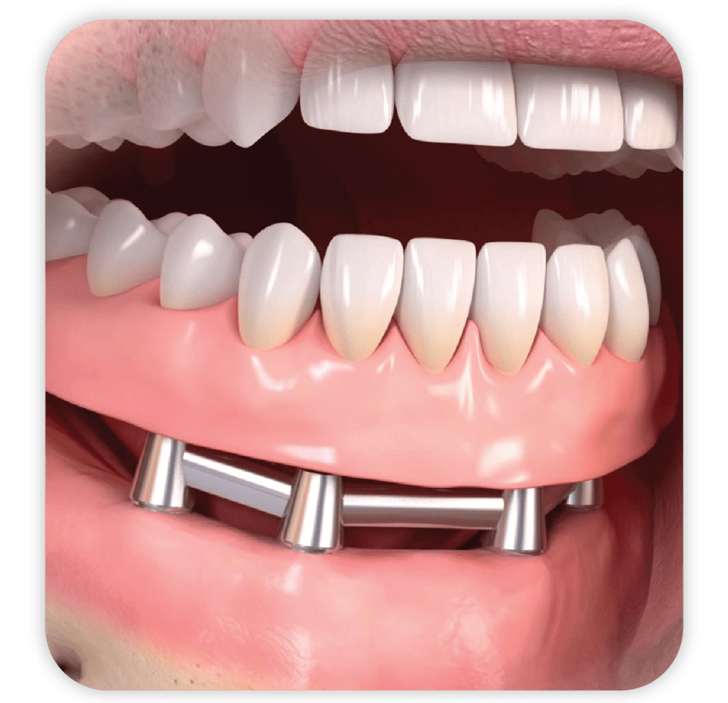 If you’re missing most of your teeth, this option gives you a full set of fixed teeth that look and feel natural. It replaces all teeth in the upper or lower jaw using four to six dental implants. We use German/Swiss implants.